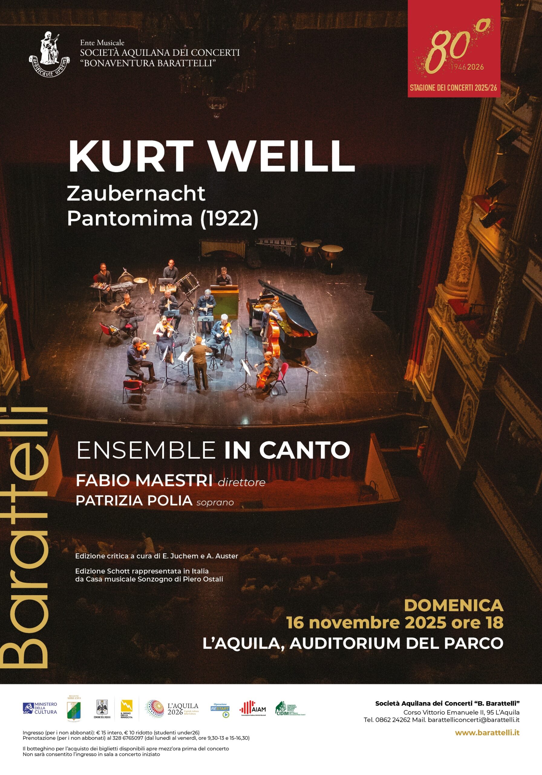 CS161125 Il 16 novembre la “Notte incantata” di Kurt Weill con i testi di Sandra Petrignani è eseguita a L’Aquila dall’Ensemble InCanto diretto da Fabio Maestri.