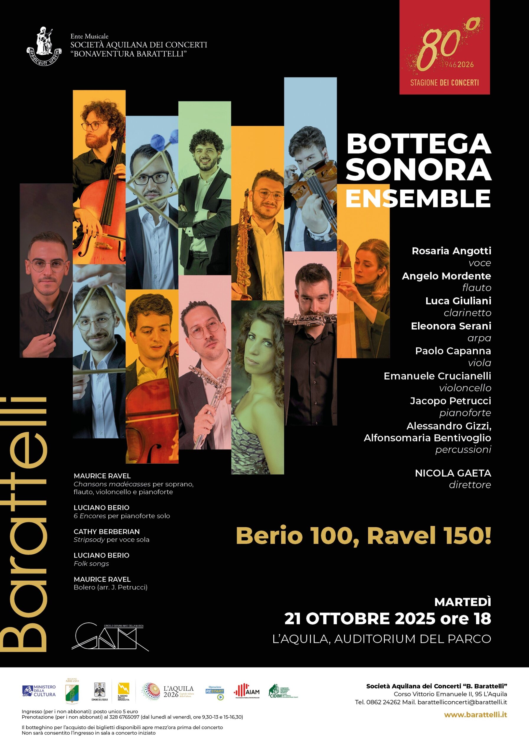 CS 211015 Martedì 21 ottobre Bottega Sonora Ensemble apre la stagione del Circolo Giovani amici della Musica con un omaggio a Berio e Ravel: “Berio 100, Ravel 150!”