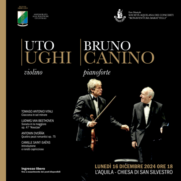 CS161224 Uto Ughi e Bruno Canino in concerto all’Aquila, lo straordinario evento promosso dall’Assessorato alla Cultura della Regione Abruzzo in collaborazione con la Società Aquilana dei Concerti “B. Barattelli”.