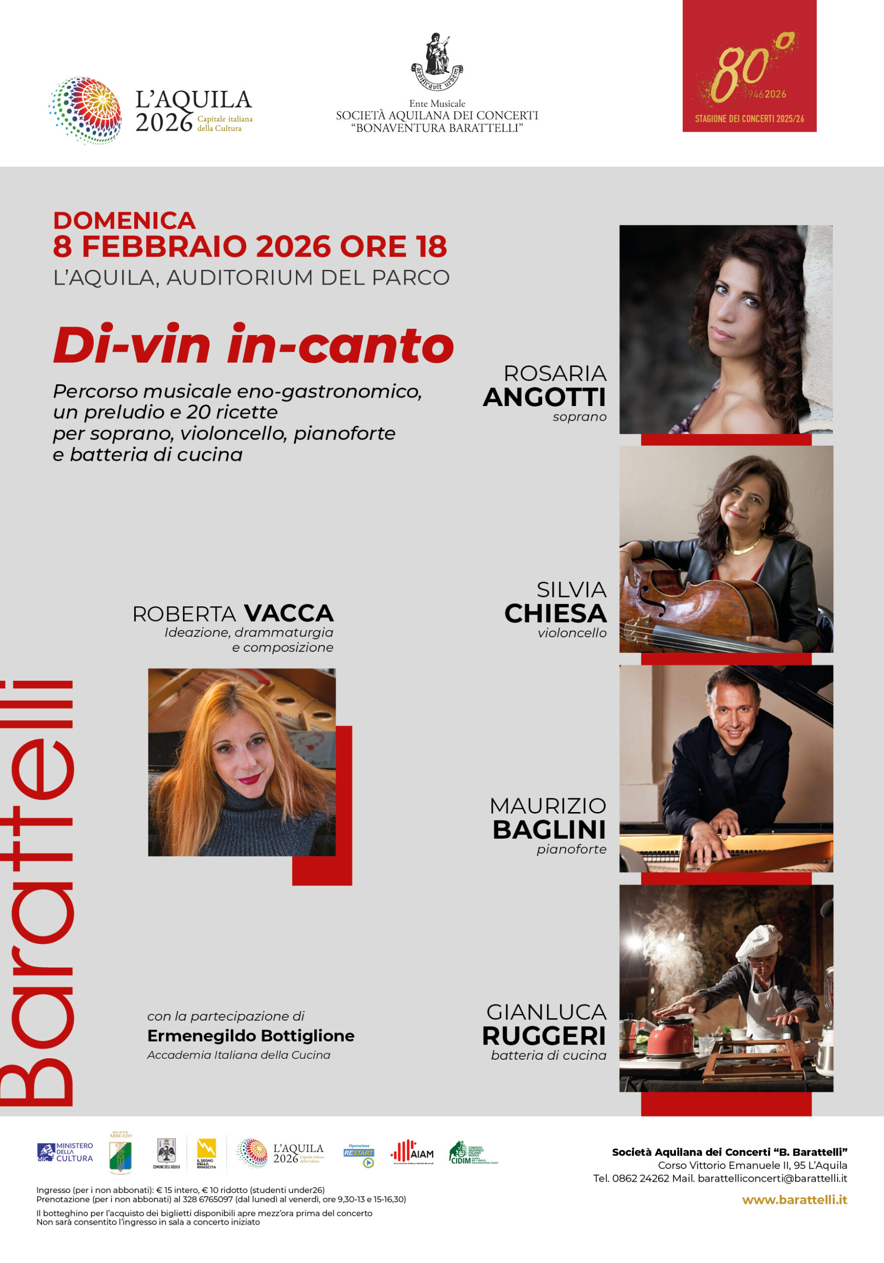 CS080226 Domenica 8 febbraio la Barattelli porta in scena: “Di-vin in-canto”, percorso musicale ed enogastronomico di Roberta Vacca in prima esecuzione nella nuova versione.