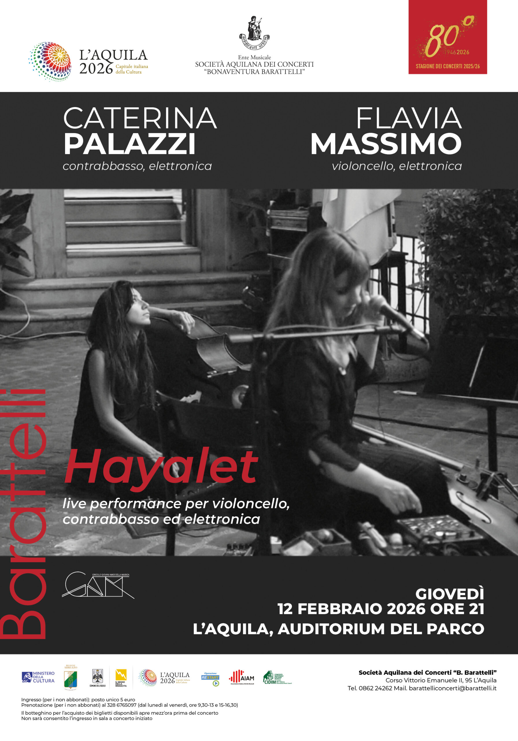 CS120226 La violoncellista Flavia Massimo e la contrabbassista Caterina Palazzi presentano “Hayalet” live performance per “cullare lo spettatore in un viaggio crepuscolare”. Appuntamento a L’Aquila giovedì 12 febbraio per la Barattelli.