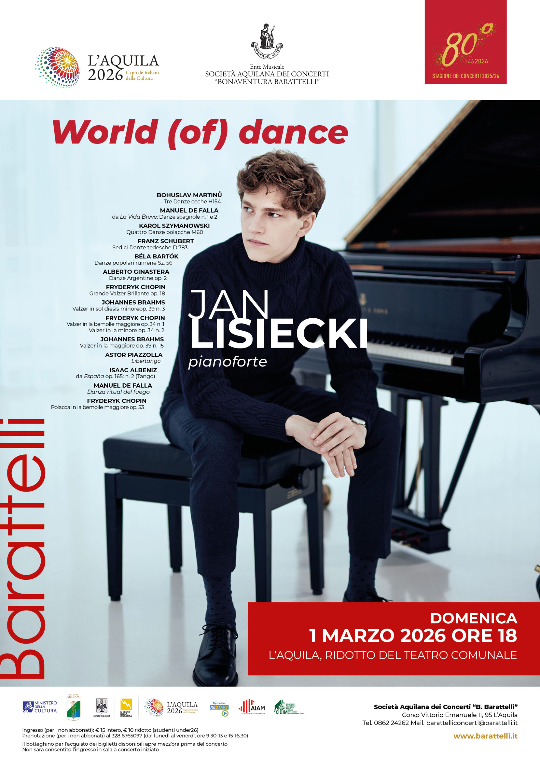 CS010326 Domenica 1 marzo approda a L’Aquila il “World (of) dance” del grande pianista Jan Lisiecki. Nell’ottantesima stagione della Barattelli il giovane talento canadese propone un appassionante viaggio musicale fra le forme della danza nel repertorio pianistico.