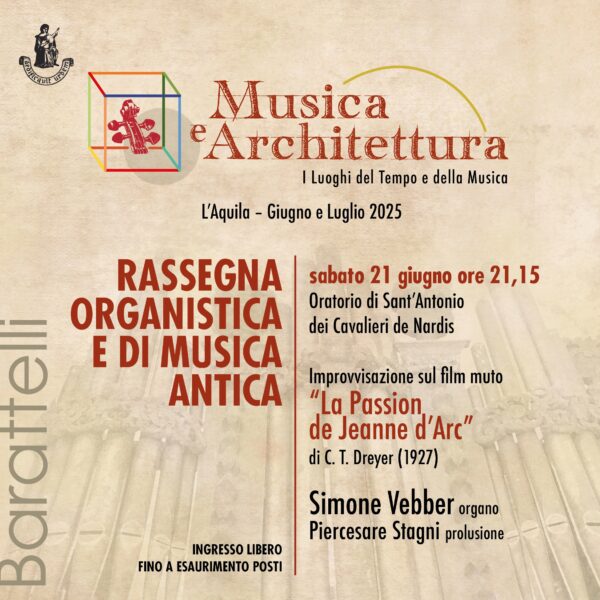 CS210625 Al via Musica e Architettura il 21 giugno per la Festa della Musica. La Barattelli propone sei eventi in luoghi simbolici della città dell’Aquila. Cinema e musica per l’inaugurazione: sonorizzazione in live del film “La passione di Giovanna D’Arco” con l’organista Simone Vebber