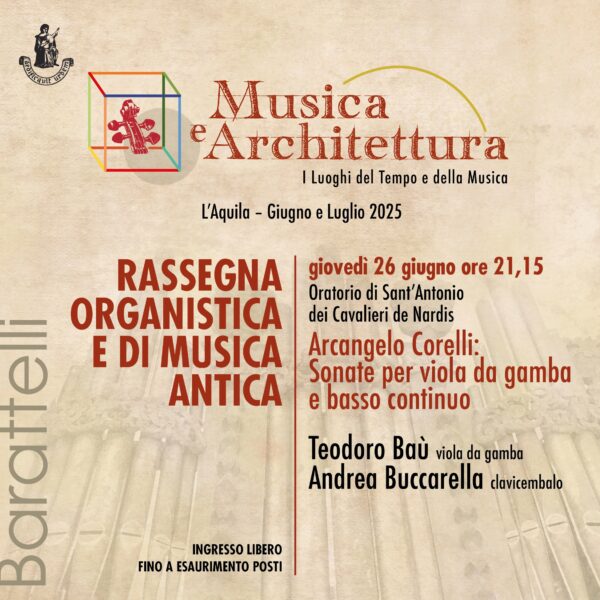 CS260625 Musica antica: il duo formato da Teodoro Baù viola da gamba e Andrea Buccarella clavicembalo per le Sonate di Corelli. Il 26 giugno all’Oratorio de Nardis.