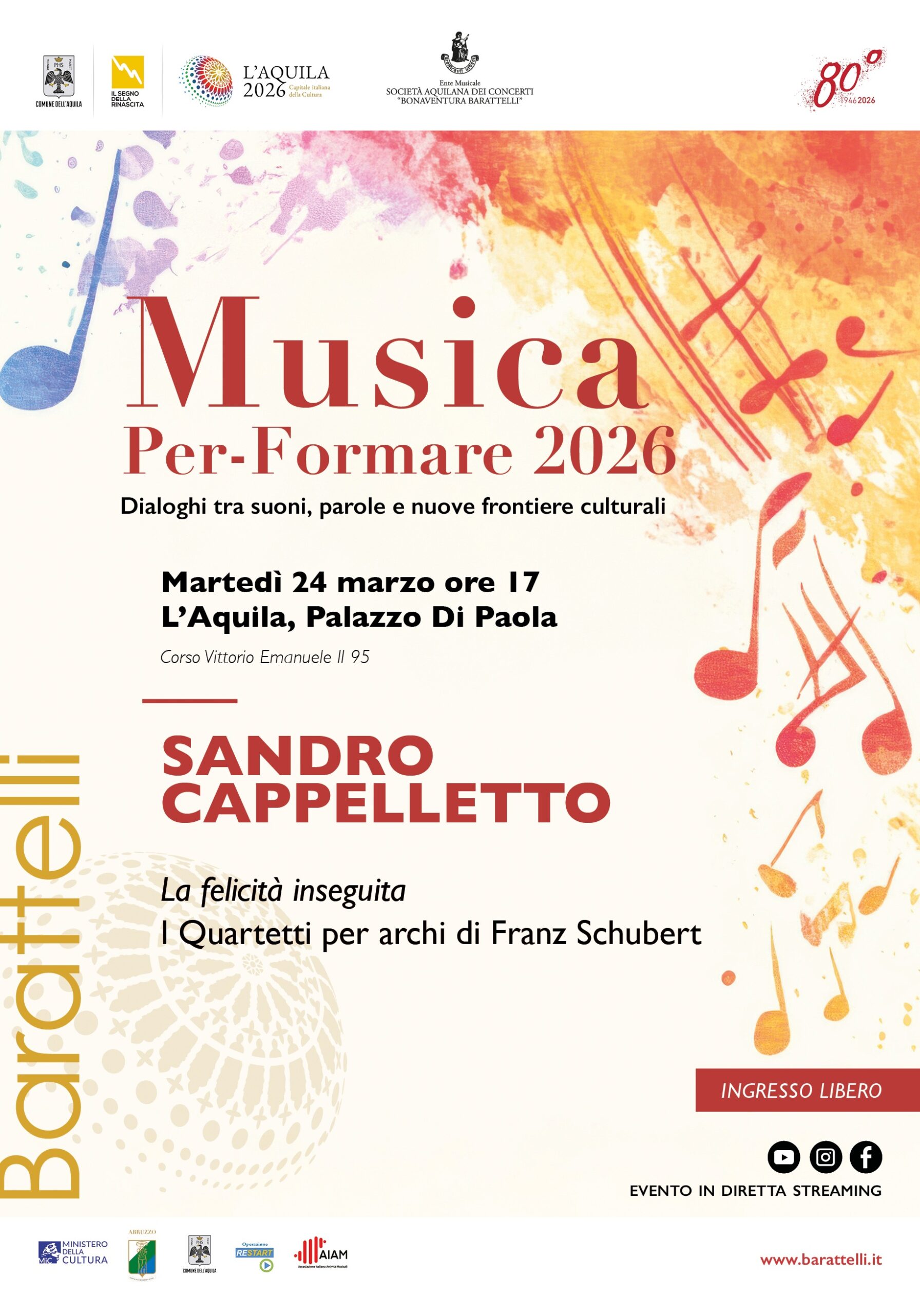 CS240326 Incontro con Sandro Cappelletto per raccontare “La felicità inseguita” di Franz Schubert attraverso i suoi quartetti per archi. Appuntamento il 24 marzo nell’ambito di “Musica Per-Formare”, progetto della Barattelli per L’Aquila Capitale Italiana della Cultura 2026