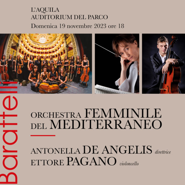 CS191123 Il 19 novembre approda a L’Aquila il tour con la star giovanissima del violoncello Ettore Pagano con l’Orchestra Femminile del Mediterraneo diretta da Antonella De Angelis.