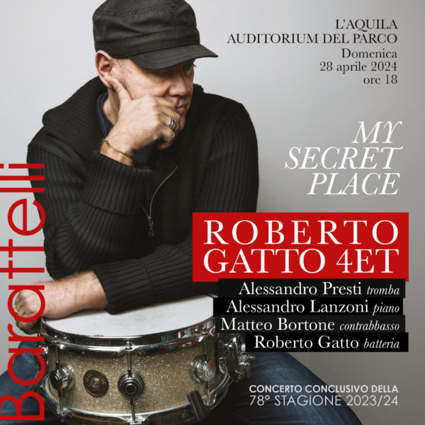 CS280424 Domenica 28 aprile, il concerto conclusivo della 78ma stagione della Barattelli è affidato al Roberto Gatto Quartet con il live dell’ultimo progetto “My Secret Place”.